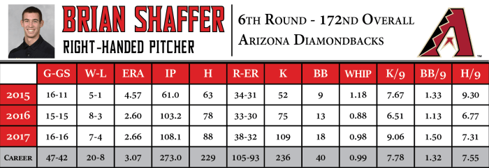 Brian Shaffer, the 2017 Big Ten Pitcher of the Year, was selected in the 6th round (172nd overall) by the Arizona Diamondbacks in the Major League Baseball Draft, Tuesday. He was the second Terp taken in the 2017 MLB Draft, after Kevin Smith was taken by the Toronto Blue Jays in the 4th round.